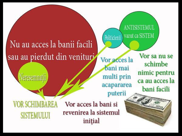 – a treia categorie sunt cei care fac parte din a doua categorie si pozeaza ca sustinatori ai primei categorii. Aici intra politicienii care afirma, unii bombastic, ca sunt solutia, ca sunt “aparatorii strazii” si ca vor schimbarea. Nu vor decat accesul la si mai multi bani prin confiscarea puterii. Sunt cei mai periculosi. Ne pot fura viitorul personal sau al copiilor si nepotilor nostri.