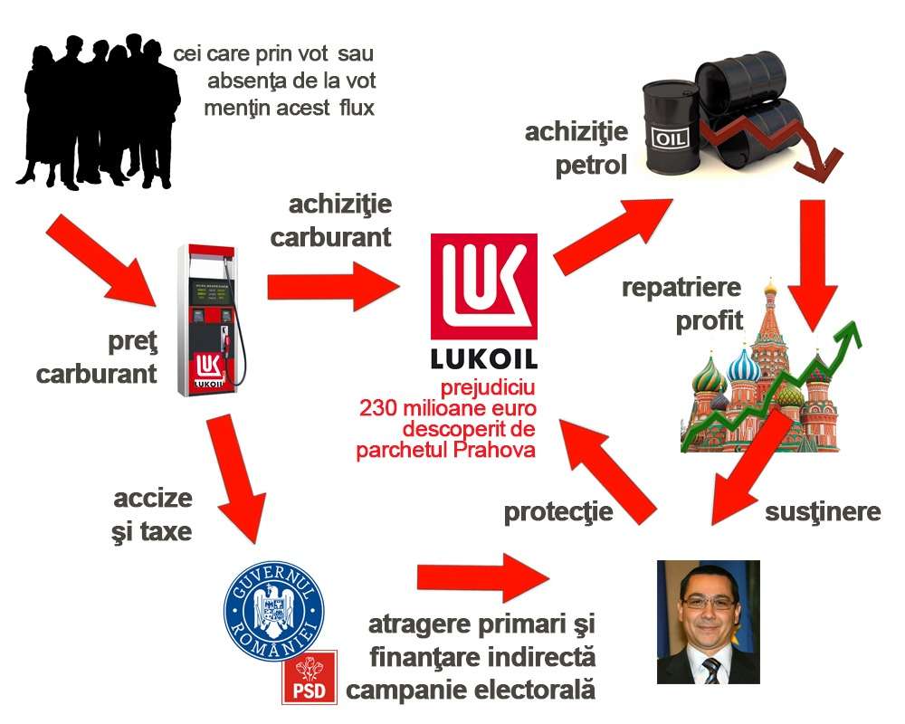 Iata asadar de ce a intervenit Ponta in dosarul Lukoil: pentru ca prin popriri ar fi fost deposedat de o sursa de bani importanta pentru PSD. Interesul acestuia era ca, probabil in urma intelegerii cu rusii (voi va trimiteti banii in Rusia, noi ne luam banii din accize si taxe), partile sa fie multumite si mecanismul sa nu fie oprit. Cine plateste in continuare acelasi pret pe carburanti? Populatia, inclusiv pensionarii de grija carora moare PSD-ul. Firmele mari de transport isi aduc carburantii din Bulgaria sau Ungaria sau alimenteaza in afara tarii.