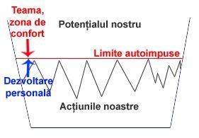 Exemplul mi se pare sugestiv pentru majoritatea actiunilor noastre. Fara a ne testa potentialul, decat in situatii limita, majoritatea dintre noi ne raportam modificam interiorul in functie de exterior si nu invers. Ne alaturam, astfel, unei mase de plangaciosi, pentru ca suntem convinsi de o fatalitate a destinului, de incapacitatea de a trece de niste “vitregii ale sortii” care ne sunt date si care ne limiteaza. Asta in timp ce, daca citim si continuam sa crestem personal, aflam ca majoritatea limitelor noastre sunt autoimpuse: ele sunt miscate in sus, marindu-ne aria de actiune si succes de dezvoltarea personala si ne sunt ingustate si impinse in jos de teama (de esec, de a pierde, de critica, …) sau de zona de confort in care ne complacem (vezi imaginea).